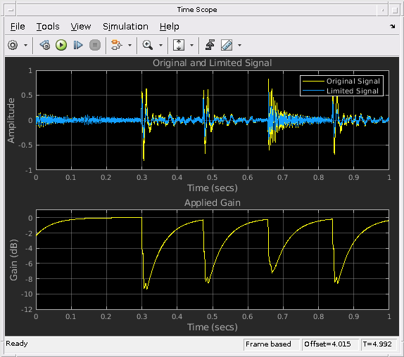 Блок Limiter обрабатывает кадр сигнала кадром и поэлементно.
