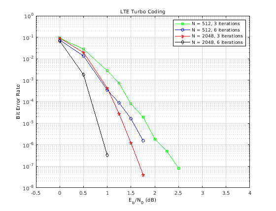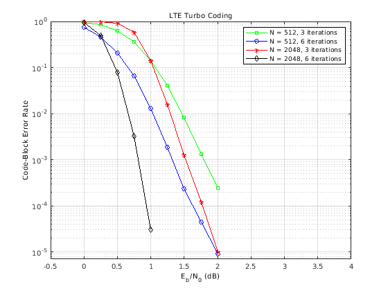 Когда данные показывают, итеративная производительность декодирования улучшается с увеличением количества декодирования итераций (за счет вычислительной сложности) и большие длины блока (за счет декодирования задержки).
