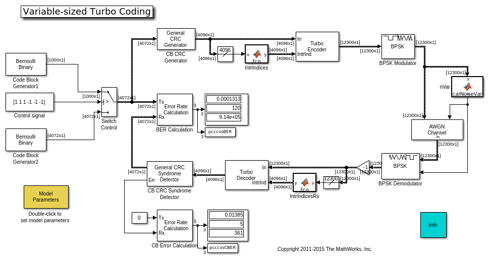 Модель настраивается, чтобы запуститься, два пользователя задали длины блока кода, которые отличаются согласно выбранному управляющему сигналу. interleaver индексы на длину блока и шумовое отклонение вычисляются на временной шаг. Используя детектор синдрома CRC, модель отображает частоту появления ошибочных блоков кода в дополнение к частоте ошибок по битам, когда первый - более соответствующий показатель производительности с блоками кода переменного размера.