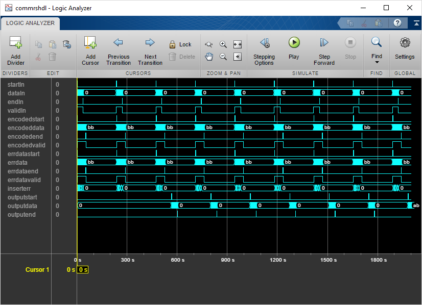 Logic Analyzer может использоваться, чтобы просмотреть несколько сигналов в одном окне и просматривающих сигналов, этот путь облегчает наблюдать переходы. Сигналы в этой модели на различных этапах, а именно, перед кодированием, после кодирования, после добавления шума, и после декодирования передаются потоком. Синий значок в модели указывает на переданные потоком сигналы. Запустите Logic Analyzer от панели инструментов модели.