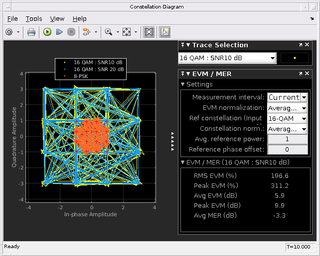 Из окна Constellation Diagram выберите опции под Tools> Measurements, чтобы отобразить панели Signal Quality и Trace Selection. По умолчанию эти панели прикрепляются в окне Constellation Diagram, когда отображено.