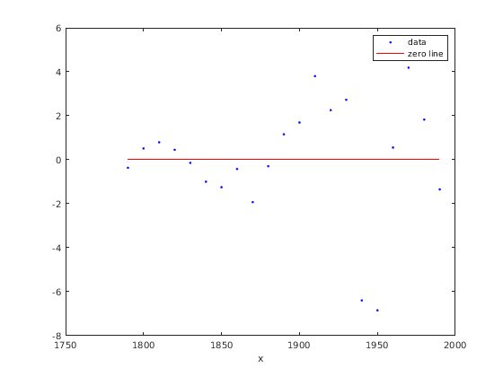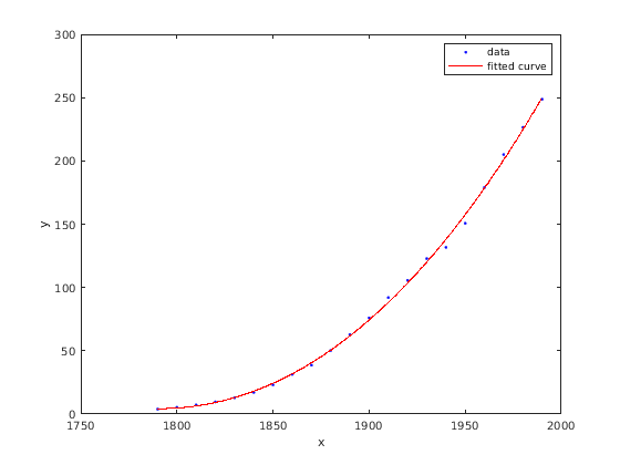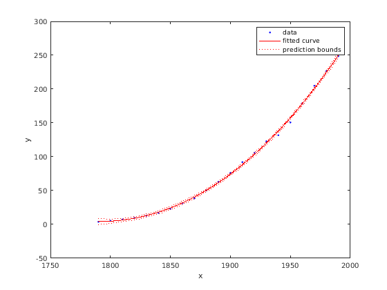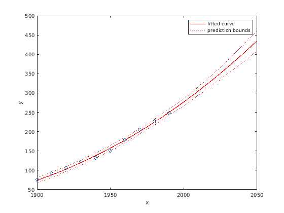 plot(cdate,pop,'o') xlim([1900,2050]) hold on plot(curvefit,'predobs') hold off