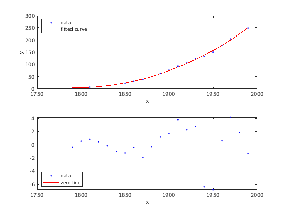 plot(curvefit,cdate,pop,'fit','residuals') legend Location SouthWest subplot(2,1,1) legend Location NorthWest