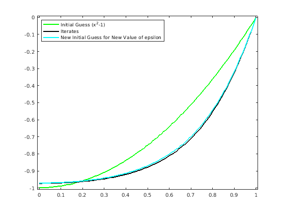 intmat = colmat([2 1+(1:(n-2))*3,1+(n-1)*3],:); y = spmak(knots,[0 fnval(z,colsites) 0]/intmat.'); fnplt(y,'c'); ax = gca; h = ax.Children; legend(h([6 5 1]),{'Initial Guess (x^2-1)' 'Iterates' ... 'New Initial Guess for New Value of epsilon'}, ... 'location','NW');