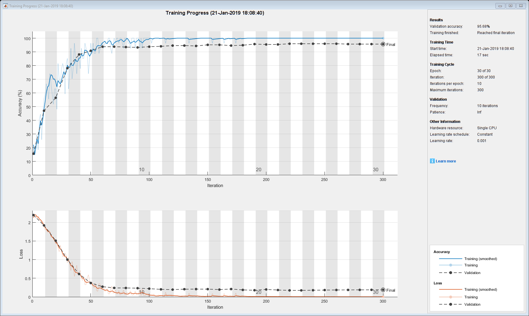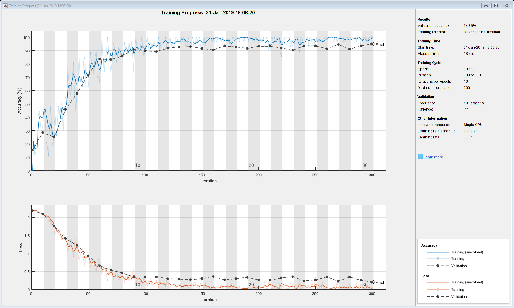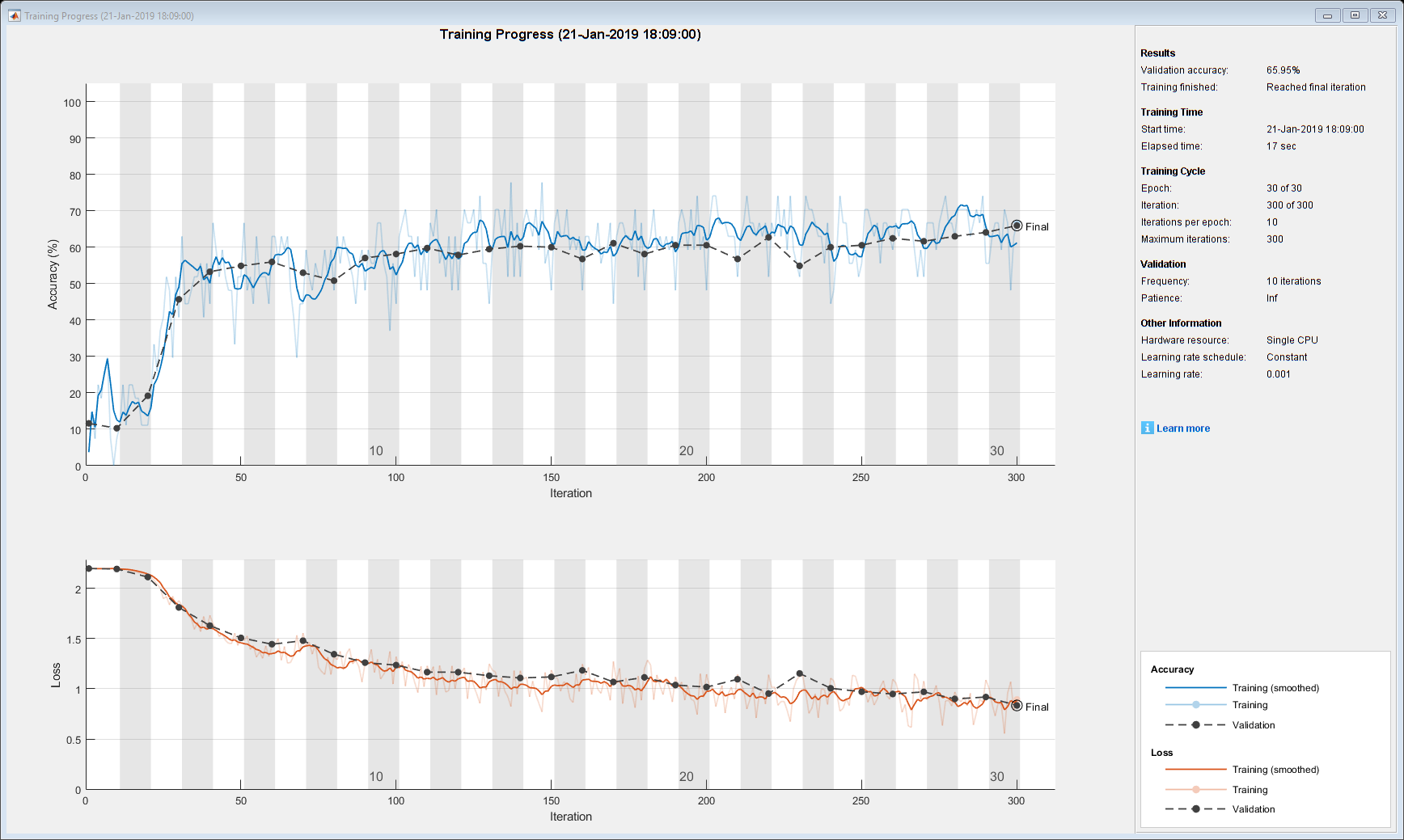 maxEpochs = 30; miniBatchSize = 27; numObservations = numel(XTrain); numIterationsPerEpoch = floor(numObservations / miniBatchSize); options = trainingOptions('adam', ... 'ExecutionEnvironment','cpu', ... 'MaxEpochs',maxEpochs, ... 'MiniBatchSize',miniBatchSize, ... 'GradientThreshold',2, ... 'ValidationData',{XValidation,YValidation}, ... 'ValidationFrequency',numIterationsPerEpoch, ... 'Verbose',false, ... 'Plots','training-progress');