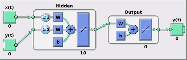 Прежде чем мы сможем обучить сеть, мы должны использовать первые два такта внешнего входа и временных рядов обратной связи, чтобы заполнить два состояния задержки касания сети.