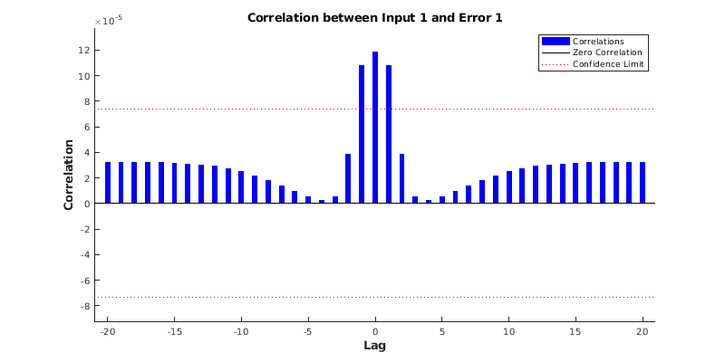 Точно так же PLOTINERRCORR показывает корреляцию ошибки относительно входных параметров с различными степенями задержки. В этом случае большинство или все строки должны находиться в пределах пределов достоверности, включая центральную линию.