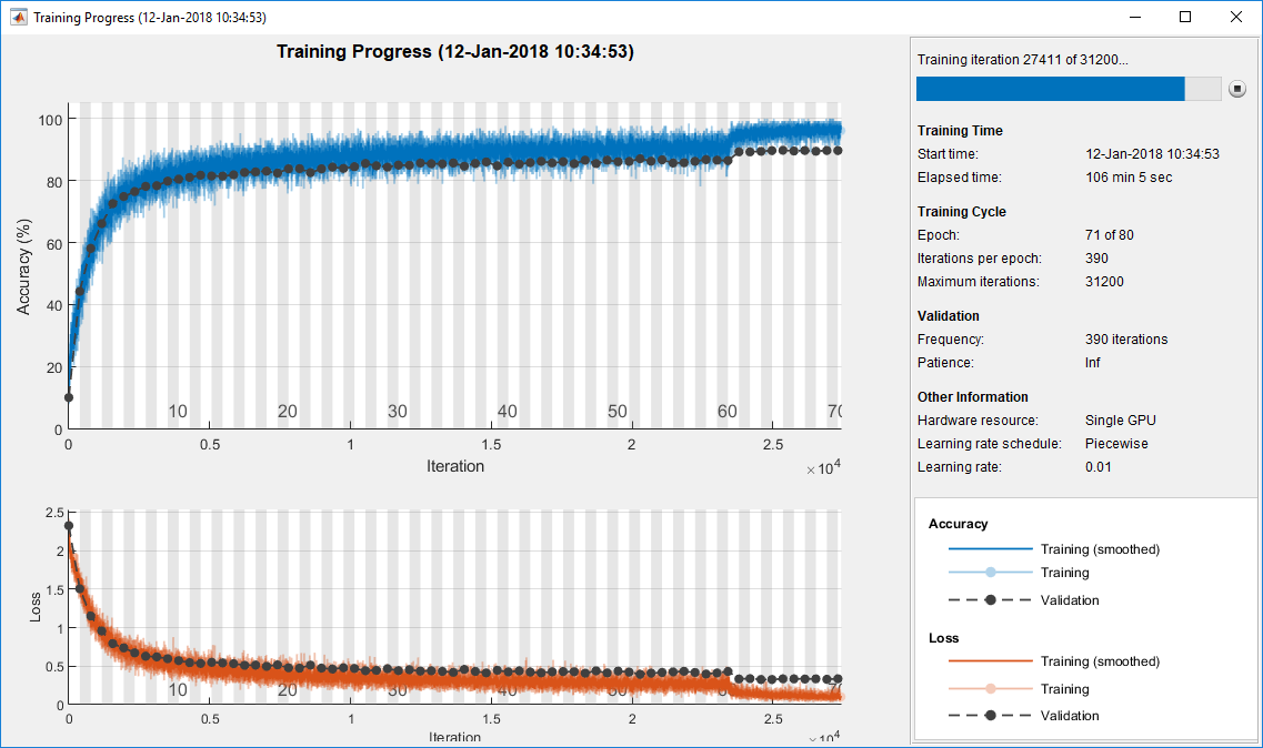 miniBatchSize = 128; learnRate = 0.1*miniBatchSize/128; valFrequency = floor(size(XTrain,4)/miniBatchSize); options = trainingOptions('sgdm', ... 'InitialLearnRate',learnRate, ... 'MaxEpochs',80, ... 'MiniBatchSize',miniBatchSize, ... 'VerboseFrequency',valFrequency, ... 'Shuffle','every-epoch', ... 'Plots','training-progress', ... 'Verbose',false, ... 'ValidationData',{XValidation,YValidation}, ... 'ValidationFrequency',valFrequency, ... 'LearnRateSchedule','piecewise', ... 'LearnRateDropFactor',0.1, ... 'LearnRateDropPeriod',60);