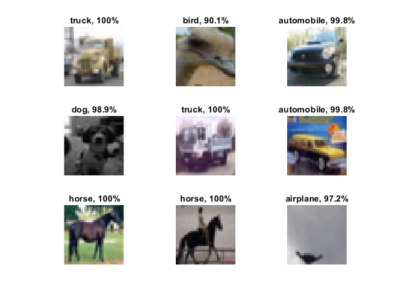 figure idx = randperm(size(XValidation,4),9); for i = 1:numel(idx) subplot(3,3,i) imshow(XValidation(:,:,:,idx(i))); prob = num2str(100*max(probs(idx(i),:)),3); predClass = char(YValPred(idx(i))); title([predClass,', ',prob,'%']) end