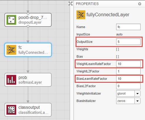 Перетащите новый fullyConnectedLayer из Библиотеки Слоя на холст. Отредактируйте OutputSize к количеству классов в новых данных, в этом примере, 5.