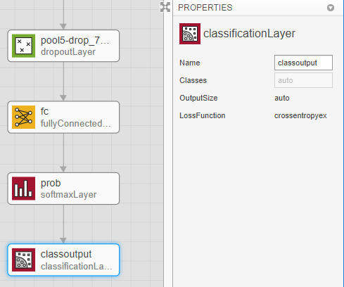 Замените выходной слой. Прокрутите в конец Библиотеки Слоя и перетащите новый classificationLayer на холст. Удалите исходный слой output и соедините свой новый слой вместо этого.