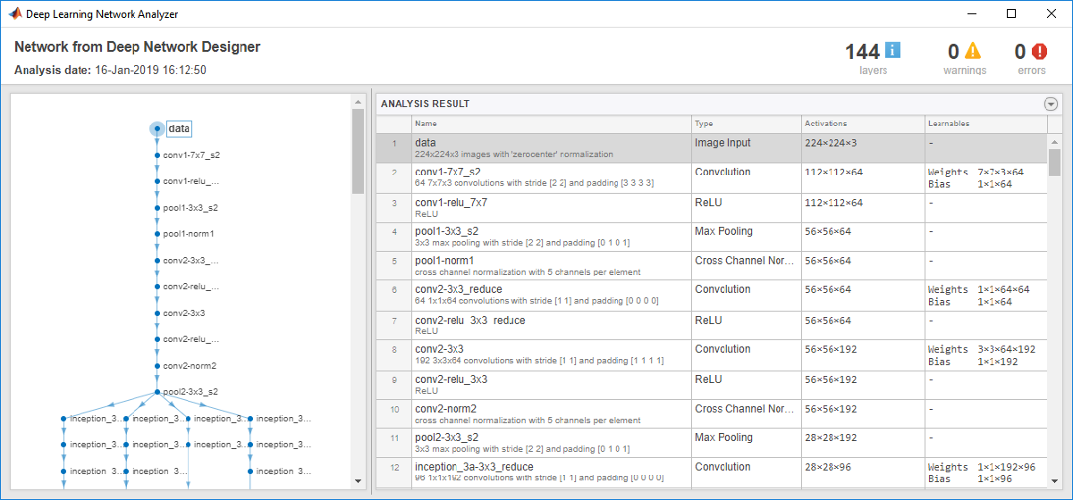 Чтобы убедиться ваша отредактированная сеть готова к обучению, нажмите Analyze и обеспечьте Нейронной сети для глубокого обучения нулевые ошибки отчетов Анализатора.