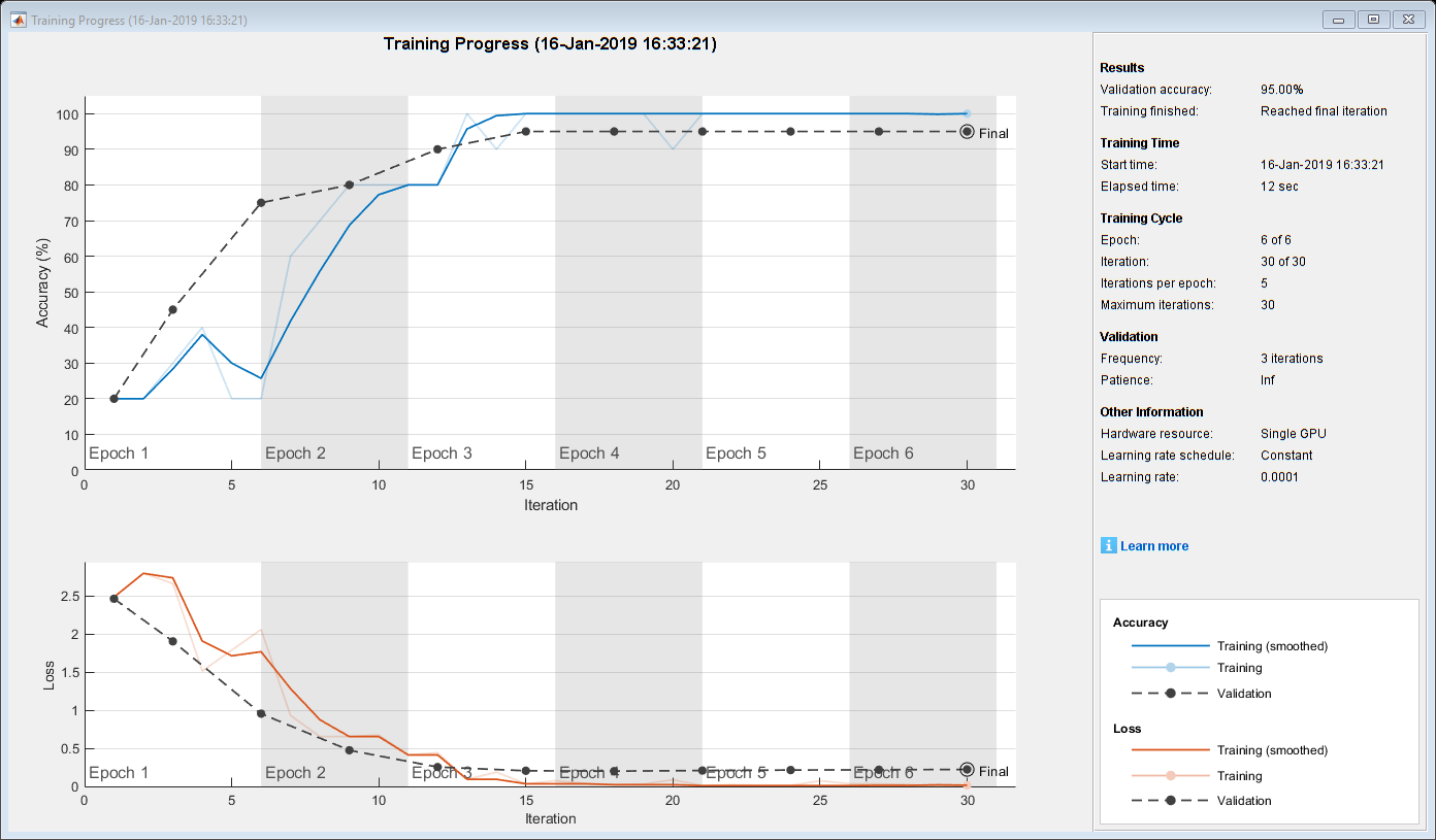 options = trainingOptions('sgdm', ... 'MiniBatchSize',10, ... 'MaxEpochs',6, ... 'Shuffle','every-epoch', ... 'InitialLearnRate',1e-4, ... 'ValidationData',augimdsValidation, ... 'ValidationFrequency',6, ... 'Verbose',false, ... 'Plots','training-progress');