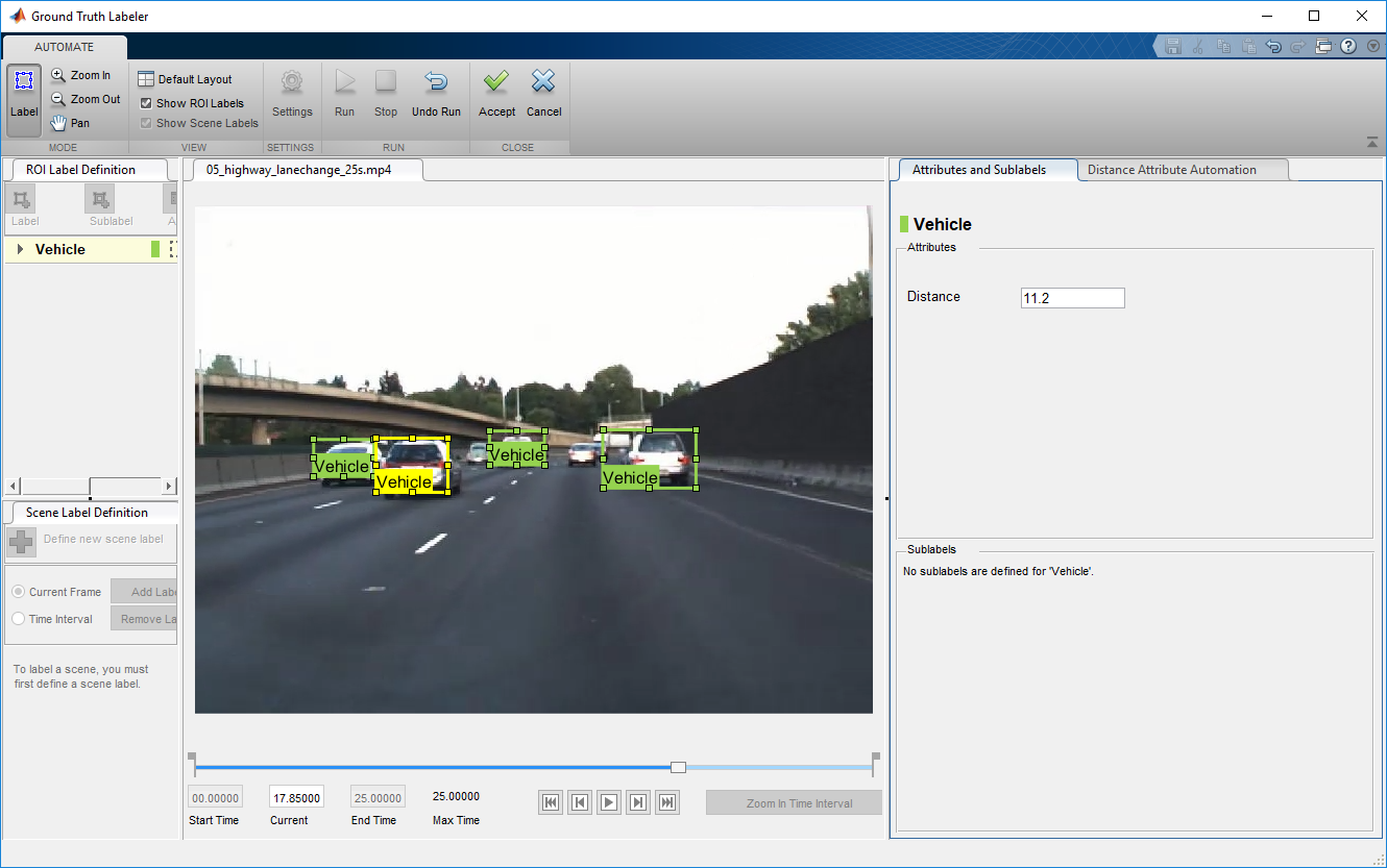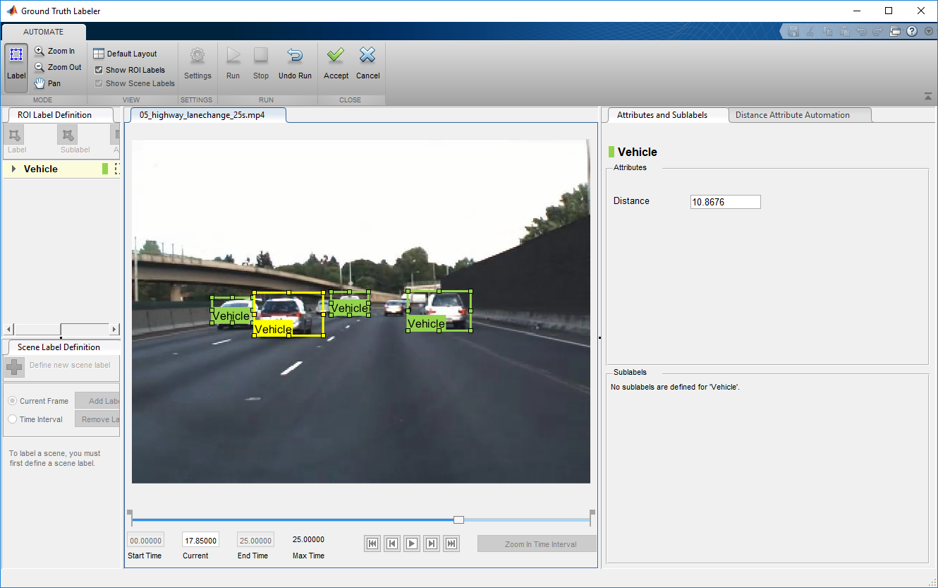Автоматизированное обнаружение автомобиля и маркировка атрибута расстояния на видео завершены. Можно теперь маркировать другие предметы интереса и установить их атрибуты, сохранить сеанс или экспортировать результаты этой запущенной маркировки.