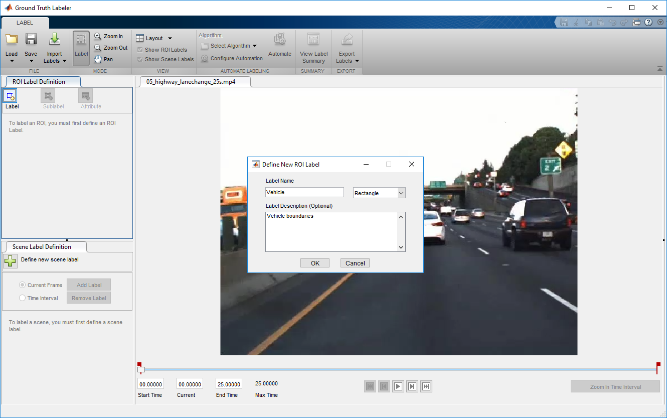 В ROI Маркируют панель Definition слева, нажимают Label. Задайте метку с именем Vehicle и введите Rectangle. Опционально, добавьте описание метки. Затем нажмите ОК.