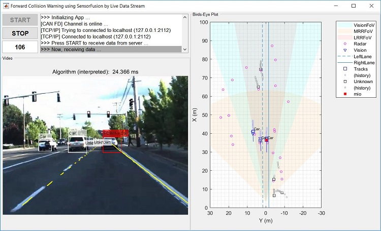 Чтобы открыть получение приложение FCW, выполните функцию helperStartReceiver. Можно нажать START, чтобы начать прием данных, обработку и визуализацию. Можно исследовать функцию helperStartReceiver, чтобы видеть, как Vehicle Network Toolbox функции CAN FD, Instrument Control Toolbox функции TCP/IP и возможности Automated Driving Toolbox используется друг совместно с другом.