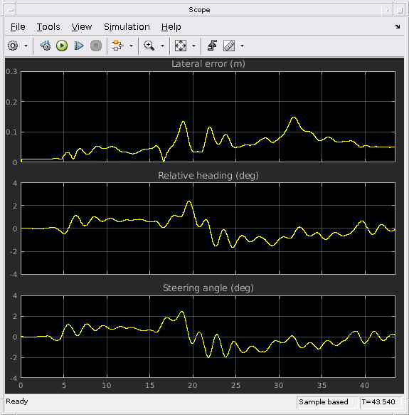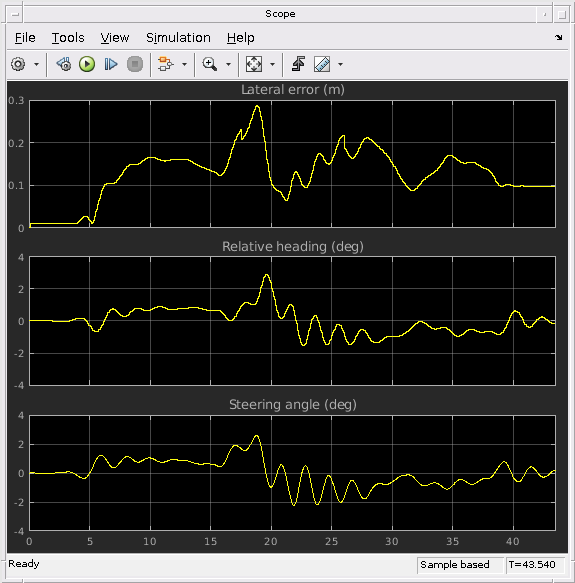 Можно также использовать Simulink® Scope в подсистеме Автомобиля и Среды, чтобы осмотреть производительность контроллера, когда автомобиль следует за запланированным путем. Осциллограф показывает, что максимальное отклонение от пути составляет меньше чем 0,3 метра, и самое большое руководящее угловое значение является меньше чем 3 градусами.