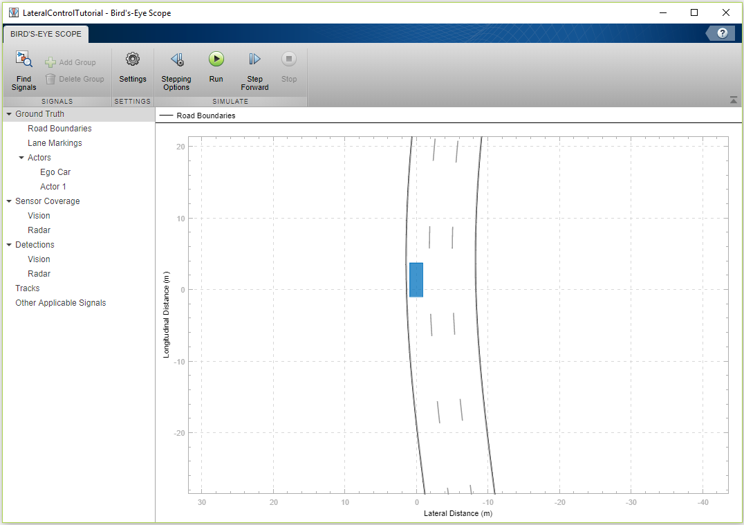 В течение симуляции автомобиль запускается в постоянной скорости 10 метров/секунда. Этот сценарий экспортировался из приложения как функция MATLAB® использование кнопки Export> Export MATLAB Function. Экспортируемую функцию называют helperCreateDrivingScenario. Дороги и агенты из этого сценария были сохранены в файл сценария LateralControl.mat.