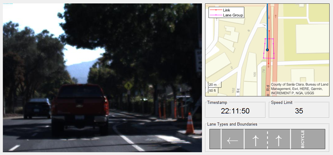 Для отображения можно получить доступ и визуализировать данные о карте высокой четкости из веб-сервиса HERE HD Live Map (HERE HDLM). Можно затем использовать эти данные, чтобы разработать ведущие алгоритмы. Можно также передать географические координаты потоком на различных картах при помощи функции geoplayer.