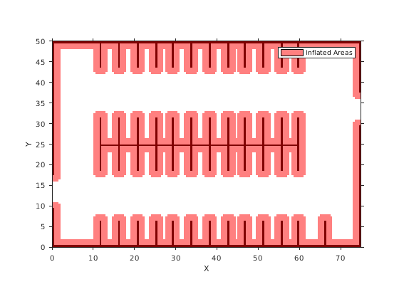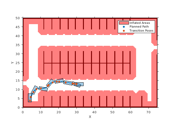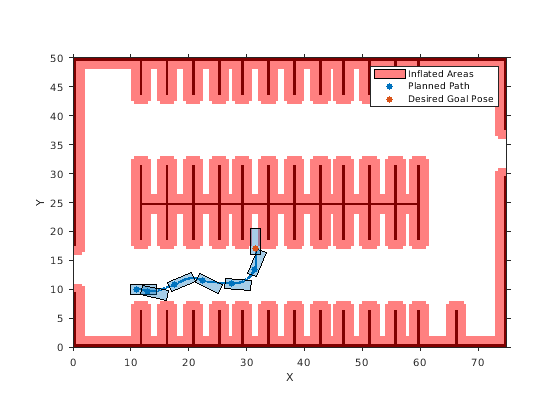 Если объект pathPlannerRRT сконфигурирован, используйте функцию plan, чтобы запланировать путь от положения запуска до цели.