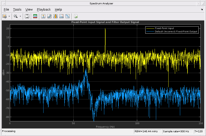 scope = dsp.SpectrumAnalyzer('SampleRate',300, ... 'PlotAsTwoSidedSpectrum',false, ... 'ShowLegend',true,'YLimits',[-85 25], ... 'Title','Fixed-Point Input Signal and Filter Output Signal', ... 'ChannelNames', ... {'Fixed-Point Input','Default (Incorrect) Fixed-Point Output'}); rng(12345); % seed the rng for repeatable results bqLPFiltFixpt = dsp.BiquadFilter('SOSMatrixSource','Input port', ... 'ScaleValuesInputPort',false); for k = 1:10 inp_sig = rand(inp_len,1) - 0.5; % random values in range (-0.5, 0.5) inputFi = fi(inp_sig + inp_itf, 1, 16, 15); % signal range (-1.0, 1.0) out_2 = bqLPFiltFixpt(inputFi,fi(num,1,16),fi(den,1,16)); scope([inputFi,out_2]) % visualize end