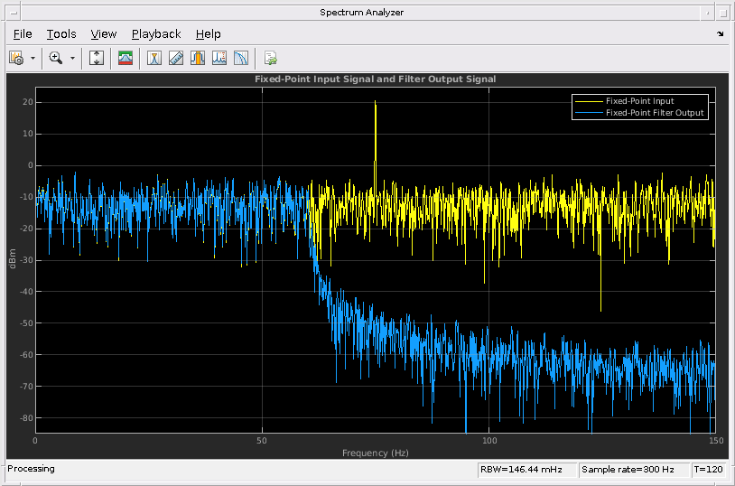 scope = dsp.SpectrumAnalyzer('SampleRate',300, ... 'PlotAsTwoSidedSpectrum',false, ... 'ShowLegend',true,'YLimits',[-85 25], ... 'Title','Fixed-Point Input Signal and Filter Output Signal', ... 'ChannelNames',{'Fixed-Point Input','Fixed-Point Filter Output'}); rng(12345); % seed the rng for repeatable results for k = 1:10 inp_sig = rand(inp_len,1) - 0.5; % random values in range (-0.5, 0.5) inputFi = fi(inp_sig + inp_itf, 1, 16, 15); % signal range (-1.0, 1.0) out_3 = myIIRLowpassBiquad_fixpt(inputFi,fi(num,1,16),fi(den,1,16)); scope([inputFi,out_3]) % visualize end