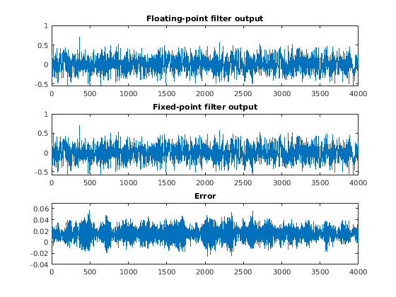 fig = figure; subplot(3,1,1); plot(out_1); title('Floating-point filter output'); subplot(3,1,2); plot(out_3); title('Fixed-point filter output'); subplot(3,1,3); plot(out_1 - double(out_3)); axis([0 4000 -4e-2 7e-2]); title('Error');
