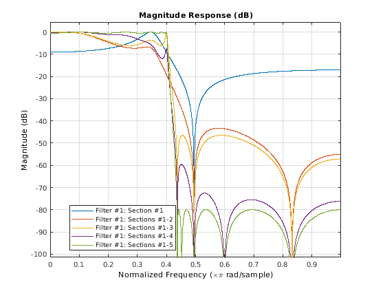 biquad = design(fdesign.lowpass('Fp,Fst,Ap,Ast',0.4,0.45,0.5,80), ... 'ellip','FilterStructure','df1sos','SystemObject',true); fvt = fvtool(biquad,'Legend','on'); fvt.SosviewSettings.View = 'Cumulative';