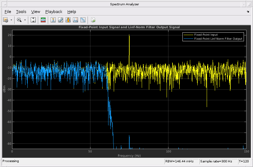 scope = dsp.SpectrumAnalyzer('SampleRate',300, ... 'PlotAsTwoSidedSpectrum',false,'ShowLegend',true, ... 'YLimits',[-85 25],'Title', ... 'Fixed-Point Input Signal and Linf-Norm Filter Output Signal', ... 'ChannelNames', ... {'Fixed-Point Input','Fixed-Point Linf-Norm Filter Output'}); rng(12345); % seed the rng for repeatable results for k = 1:10 inp_sig = rand(inp_len,1) - 0.5; % random values in range (-0.5, 0.5) inputFi = fi(inp_sig + inp_itf, 1, 16, 15); % signal range (-1.0, 1.0) out_4 = myIIRLinfBiquad_fixpt( ... inputFi,fi(numLinf,1,16),fi(denLinf,1,16)); scope([inputFi,out_4]) % visualize end