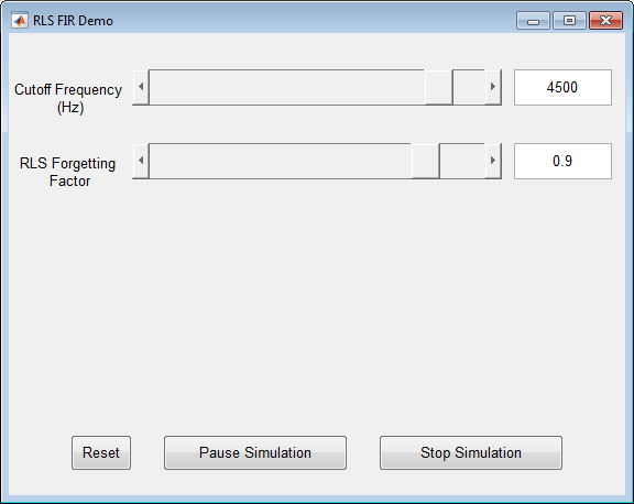 Подобно System Identification 'в качестве примера MATLAB Используя Адаптивную Фильтрацию RLS', запуская это исполняемое приложение также запускает пользовательский интерфейс. Пользовательский интерфейс позволяет вам настройкам параметров, и результаты отражаются в симуляции немедленно. Например, переместите ползунок для 'Частоты среза (Гц)' налево, в то время как симуляция запускается. Вы будете видеть уменьшение графика для частоты среза и соответствующего колебания MSE фильтра RLS. Можно использовать кнопки на пользовательском интерфейсе, чтобы приостановить или остановить симуляцию.
