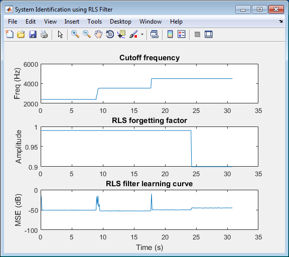 Фильтры Рекурсивных наименьших квадратов (RLS) являются адаптивными фильтрами, которые могут использоваться, чтобы идентифицировать неизвестную систему. RLSFilterSystemIDCompilerExampleApp использует фильтры RLS, чтобы идентифицировать систему, которая имеет переменную частоту среза. Система является реализованным использованием фильтра lowpass КИХ dsp. VariableBandwidthFIRFilter. Фильтр RLS реализован с помощью dsp. RLSFilter.