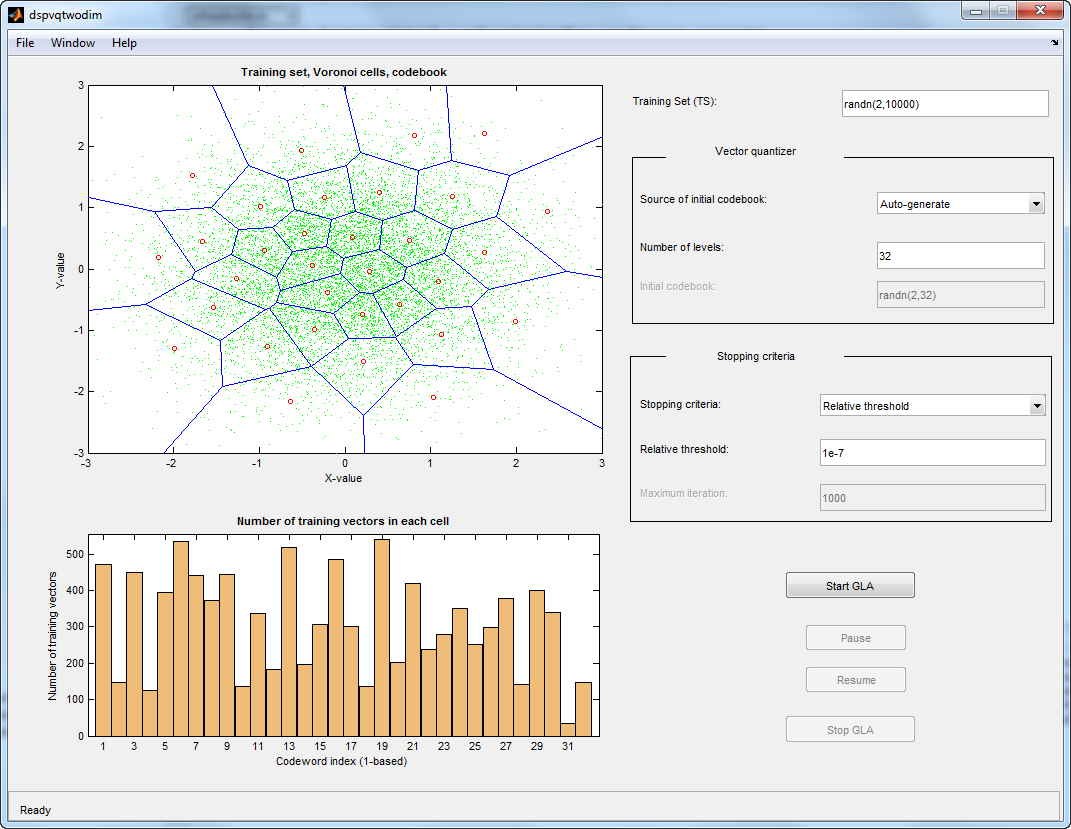 Этот пример показывает Векторный Процесс проектирования Квантизатора с помощью Обобщенного Ллойда Алгоритма (GLA) для двумерного входа.