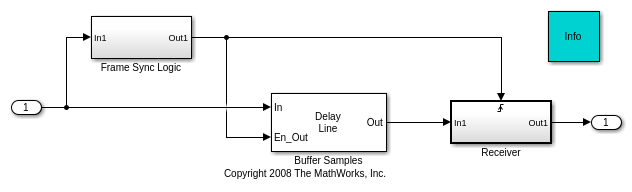 Блок Buffer Samples поддерживает внутренний кольцевой буфер для эффективной буферизации входных выборок. Это использует режим, где допустимый выходной кадр вычисляется только, когда это получает булевскую переменную, 'верную' во входном порту En_Out. Логическая подсистема Синхронизации Кадра выводит булевскую переменную, 'верную', когда соответствующий кадр, как ожидалось Получателем, был буферизован. Тот же булев сигнал также действует как триггер к подсистеме Получателя, которая обрабатывает допустимый кадр. Из-за этого расположения, выходных разделов блока Buffer Samples и подсистемы Получателя, только запущенной при необходимости. Это расположение используется в двух местах в этом примере, однажды для синхронизации символа и демодуляции и с другой стороны для синхронизации кадра и декодирования.