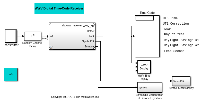 Этот пример показывает реализацию цифрового получателя, который синхронизирует с широковещательной передачей информации о временном коде по радио станцию WWV и декодирует его, чтобы отобразить информацию времени. Пример использует Simulink®, DSP System Toolbox™ и продукты Stateflow® с Функциональным блоком MATLAB®, чтобы достигнуть простого некогерентного цифрового получателя.