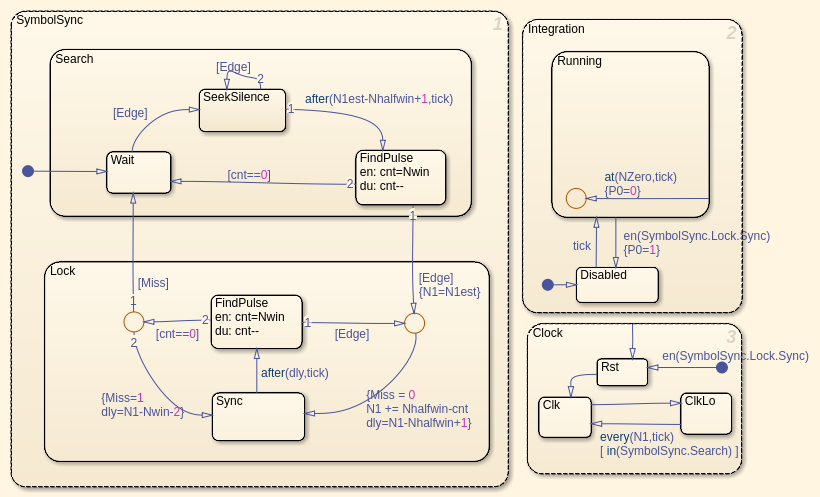 3.2) Синхронизация символа достигает синхронизации символа и создает сигнал часов, синхронизируемый с сигналом WWV. Обратите внимание на то, что синхронизация кадра сделана позже в разделе Decoder. Синхронизация использует Stateflow временная логическая функция. Эта диаграмма Stateflow состоит из трех частей: