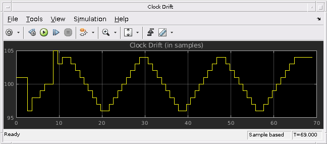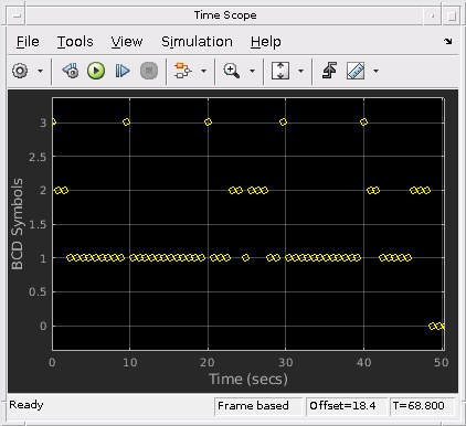 Переданные символы отображены на Декодируемом осциллографе Символов, и декодируемая информация о временном коде отображена на отображении 'Временного кода' и окне 'WWV time code'. Поля на окне 'WWV time code' представляют светодиоды, которые освещают, когда соответствующий сигнал верен. LED, соответствующий Переходу на летнее время, разделен в две части, где первая часть является 'Индикатором 1 перехода на летнее время', и вторая часть является 'Индикатором 2 перехода на летнее время'. График Дрейфа Часов показывает количество выборок между возрастающими ребрами последовательных символов (symbolClk), когда они получены. Этот график отличается между 95 и 105 выборками.