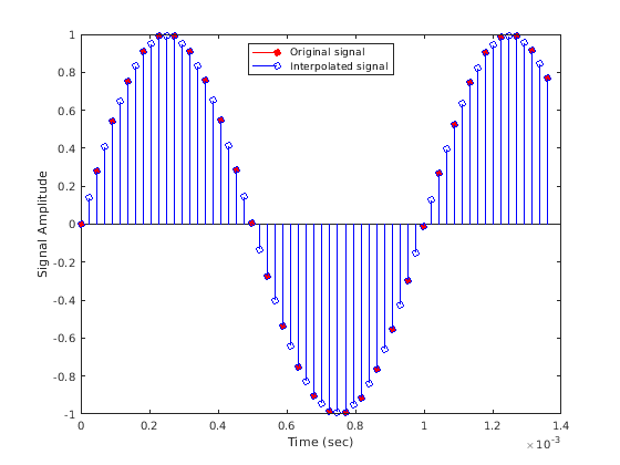 gainCIC = ... (cicint.InterpolationFactor*cicint.DifferentialDelay)... ^cicint.NumSections/cicint.InterpolationFactor; stem(n(1:31)/Fs, double(x(1:31)),'r','filled') hold on; stem(n(1:61)/(Fs*cicint.InterpolationFactor), ... double(y(1,4:end))/gainCIC,'b') xlabel('Time (sec)') ylabel('Signal Amplitude') legend('Original signal','Interpolated signal',... 'location','north') hold off;