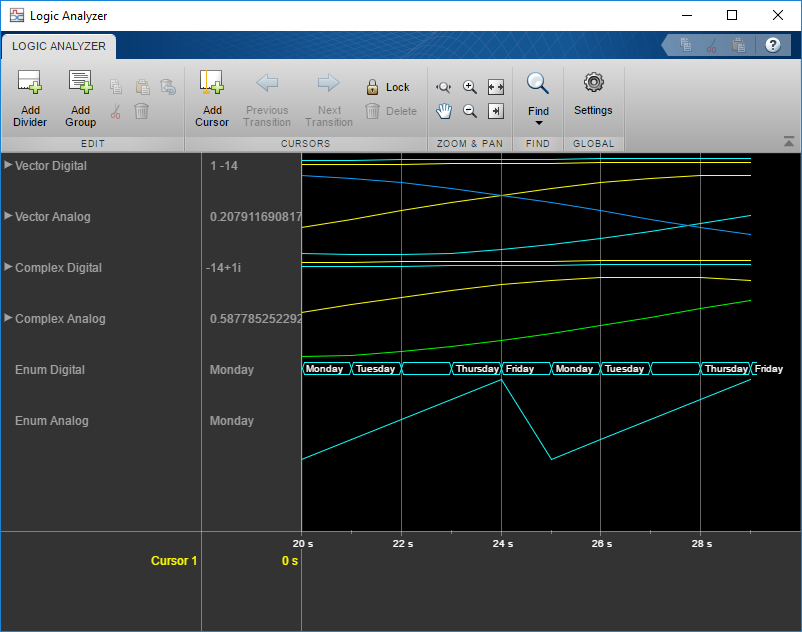 Система Logic Analyzer object™ отображает переходы в сигналах временного интервала. Используя dsp.LogicAnalyzer, вы можете: