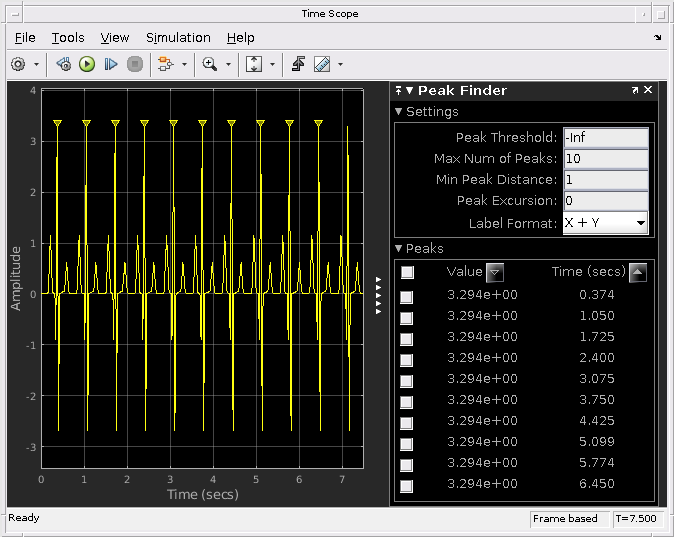 У вас должны быть Simscape™ или лицензия DSP System Toolbox, чтобы использовать Пиковое Средство поиска, Двухуровневые Измерения и Статистику Сигнала.