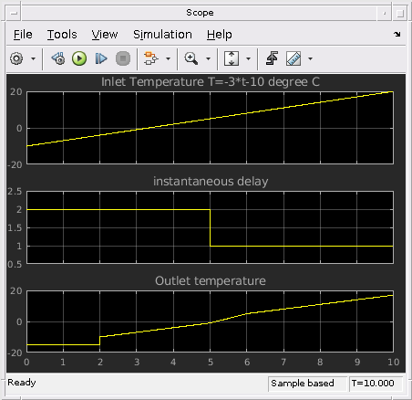 Если вы продвигаетесь через модель, осциллограф только обновляет, когда блок scope запускается. Это означает, что время, показанное в строке состояния, не может совпадать с образцовым временем.