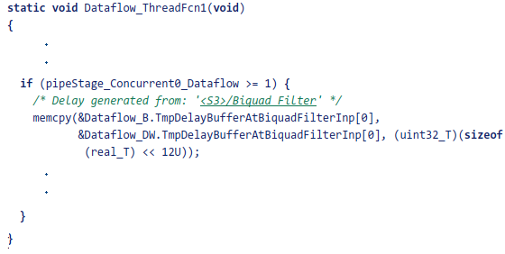 Блок Subsystem Потока данных генерирует две функции потока, Dataflow_ThreadFcn0 и Dataflow_ThreadFcn1.
