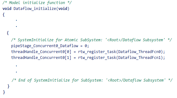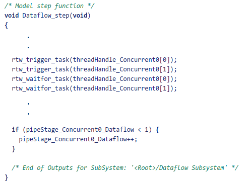 После того, как генерация кода завершается для подсистемы, можно наблюдать сгенерированные функции для каждого параллельного потока, созданного областью потока данных и как они инициированы во время выполнения образцовой ступенчатой функции.