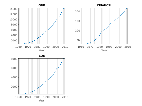 varNames = {'CPIAUCSL' 'COE' 'GDP'};