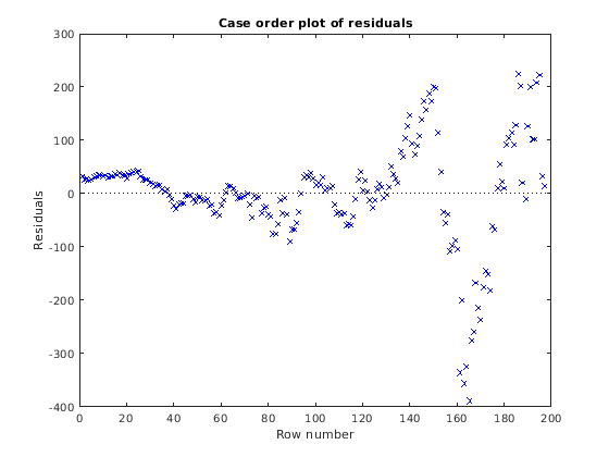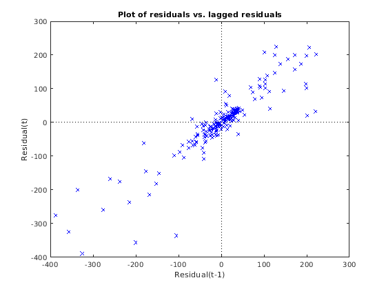 Поскольку график рассеивания невязки по сравнению с изолированной невязкой формирует тренд, автокорреляция существует в невязках. Кроме того, невязки на экстремальных значениях, кажется, становятся шире, который предлагает присутствие heteroscedasticity.