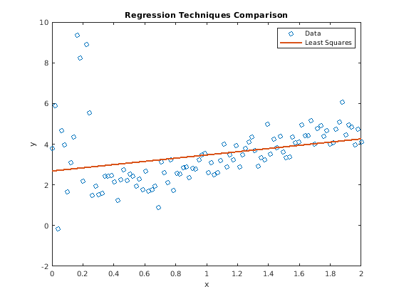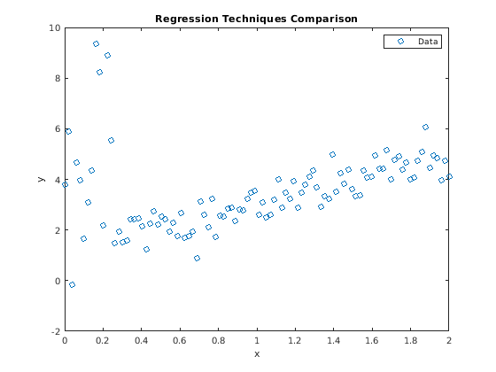 figure; plot(x,y,'o'); h = gca; xlim = h.XLim'; hl = legend('Data'); xlabel('x'); ylabel('y'); title('Regression Techniques Comparison') hold on;