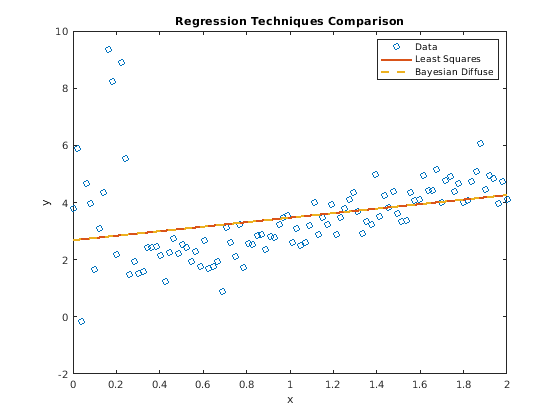 plot(xlim,[ones(2,1) xlim]*PosteriorDiffuseMdl.Mu,'--','LineWidth',2); hl.String{3} = 'Bayesian Diffuse';