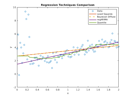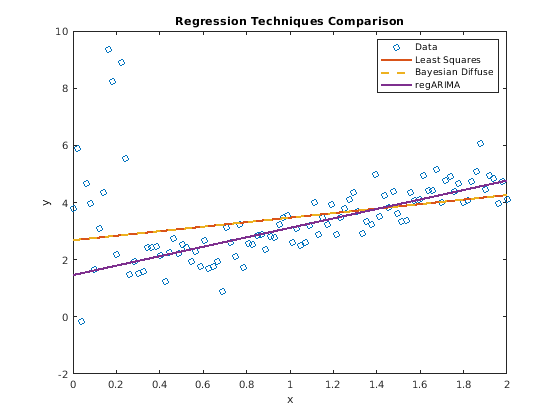 plot(xlim,[ones(2,1) xlim]*[estRegMdl.Intercept; estRegMdl.Beta],... 'LineWidth',2); hl.String{4} = 'regARIMA';