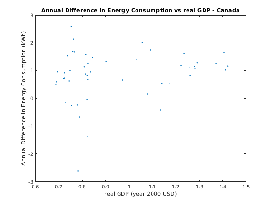 figure plot(rGDP,consumpDiff,'.') title 'Annual Difference in Energy Consumption vs real GDP - Canada'; xlabel 'real GDP (year 2000 USD)'; ylabel 'Annual Difference in Energy Consumption (kWh)';