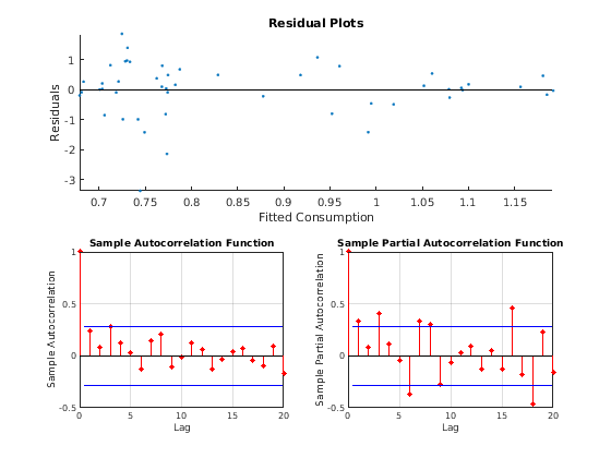 figure subplot(2,1,1) hold on plot(Mdl.Fitted,resid,'.') plot([min(Mdl.Fitted) max(Mdl.Fitted)],[0 0],'k-') title 'Residual Plots'; xlabel 'Fitted Consumption'; ylabel 'Residuals'; axis tight hold off subplot(2,2,3) autocorr(resid) h1 = gca; h1.FontSize = 8; subplot(2,2,4) parcorr(resid) h2 = gca; h2.FontSize = 8;
