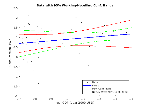 figure hold on l1 = plot(rGDP,consumpDiff,'k.'); l2 = plot(rGDP,fity,'b-','LineWidth',2); l3 = plot(rGDP,conbandnl,'r-'); l4 = plot(rGDP,NWconbandnl,'g--'); title 'Data with 95% Working-Hotelling Conf. Bands'; xlabel 'real GDP (year 2000 USD)'; ylabel 'Consumption (kWh)'; axis([0.7 1.4 -2 2.5]) legend([l1 l2 l3(1) l4(1)],'Data','Fitted','95% Conf. Band',... 'Newey-West 95% Conf. Band','Location','SouthEast') hold off